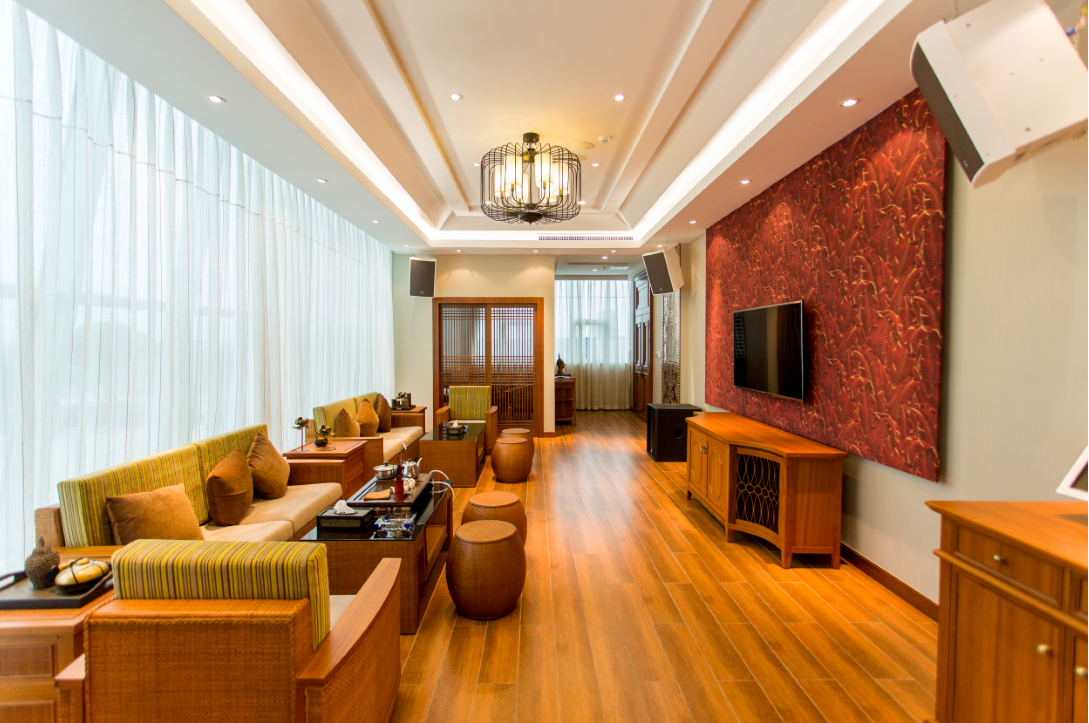 走進(jìn)棕櫚房,就會感受到濃濃的東南亞風(fēng)情,好似徜徉在熱帶雨林間。棕櫚房整體家具以原木色為主,或者多以深色系為主,局部點綴明艷的紅色或綠色,呈現(xiàn)出獨特雅致的氛圍,而又不失熱情的溫馨氛圍。同時,房間還配置了KTV、棋牌室等設(shè)施供賓客娛樂。